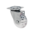 O Rodízio giratório GLAP 210 GEL Schioppa é fabricado com garfo em chapa estampada, cabeçote com pista de esferas e acabamento zincado. Possui eixo da roda rebitado e roda COLORGEL, composta por termoplástico com PVC transparente. Produzido com material reciclável.